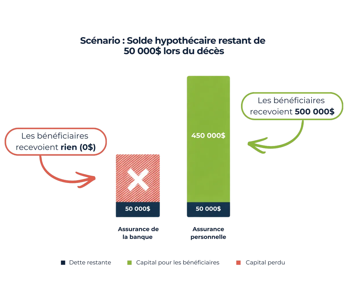 L’assurance hypothécaire personnelle permet dans la plupart des situations d’offrir une structure plus stable que celle liée à un prêteur puisque les conditions sont établies dès le départ et ne dépendent pas de l’évolution du financement ou de l’institution bancaire.